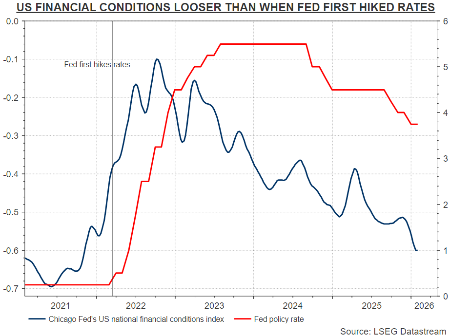 尽管美国政界正推动进一步大幅降息,且凯文·沃什已获提名将于五月接任美联储主席,但美联储面临的现实是:核心通胀率仍比目标高出整整一个百分点,金融环境已达到2021年以来最宽松水平。