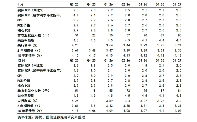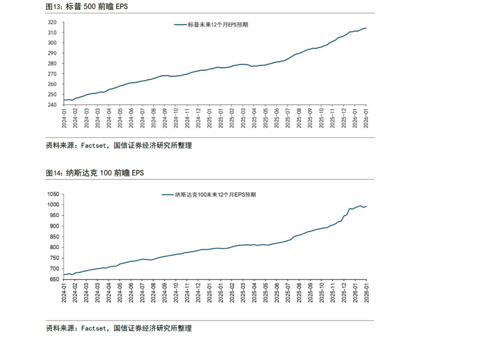 美国经济结构性特征显现:GDP增速因AI投资超预期显著上修;12月失业率回落至4.4%,但AI替代效应或从科技行业向专业服务、金融等领域扩散;住房成本对CPI贡献率下降,Zillow预测2026年业主等价租金增速将放缓至2.9%;标普500成分股未来12个月EPS预期稳健,Meta、微软等科技巨头资本开支持续上修。