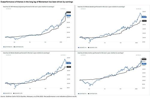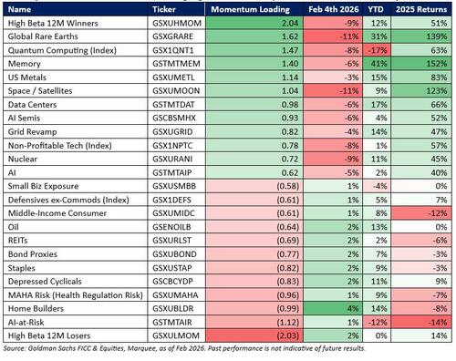 高盛同样指出,今年以来表现强劲的板块正经历剧烈反转:存储芯片、稀土及未盈利科技股均回吐了大部分年内涨幅。这也是为什么周三所有动量敞口较高的投资组合均呈下跌态势,而具有负动量的主题则全线反弹。