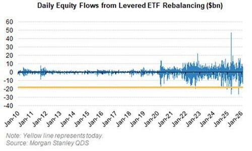 更关键的是:极度脆弱的市场结构放大了波动幅度。杠杆ETF再平衡成为主要推手,摩根士丹利估算周三杠杆ETF面临约180亿美元的抛压需求——使当天跻身历史前十之列。抛压主要集中于纳斯达克、科技股和半导体板块,英伟达、特斯拉、AMD、美光、Palantir和美光科技等个股承受显著抛压。