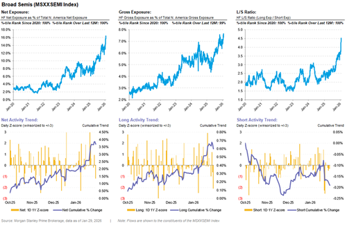 摩根士丹利交易台的观点大同小异:该行的做空动量组合周三上涨了0.8%。拥挤板块的持仓遭抛售:AI板块下跌8.5%,存储板块下跌6%,AI电力板块下跌8%。