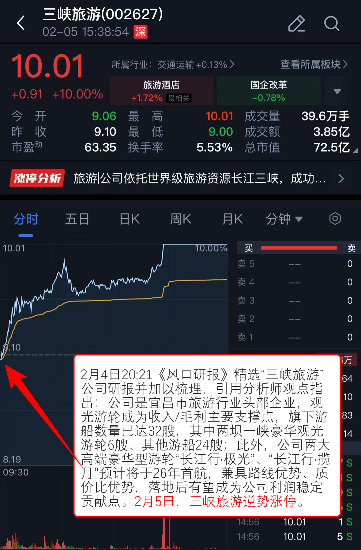往期回顾:2月4日20:21《风口研报》精选“三峡旅游”公司研报并加以梳理,引用分析师观点指出:公司是宜昌市旅游行业头部企业,观光游轮成为收入/毛利主要支撑点,旗下游船数量已达32艘,其中两坝一峡豪华观光游轮6艘、其他游船24艘;此外,公司两大高端豪华型游轮“长江行·极光”、“长江行·揽月”预计将于26年首航,兼具路线优势、质价比优势,落地后有望成为公司利润稳定贡献点。2月5日,三峡旅游逆势涨停。