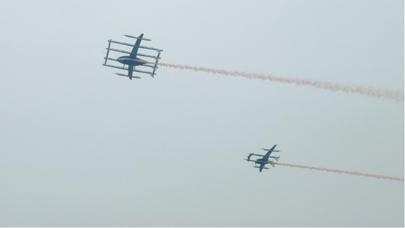 峰飞航空eVTOL V5000天际龙(左上)与V2000CG凯瑞鸥(右下)公开飞行(财联社记者摄)