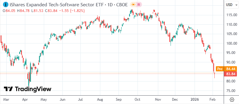追踪软件板块的热门ETF——iShares扩展科技软件行业ETF(IGV)已经连跌七天,创两年多来最长连跌纪录,交投于2025年4月以来的低位附近。