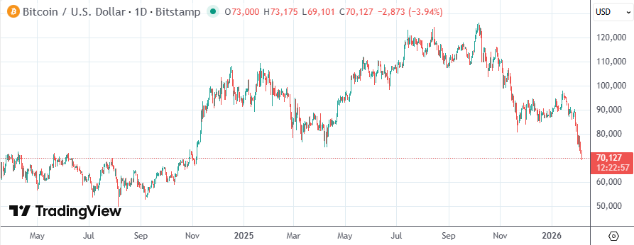 Bitstamp行情显示,比特币日内一度跌至69101美元/枚,为2024年11月7日以来的最低水平。自去年10月触及12.6万美元的历史高点以来,比特币已累计下跌40%。