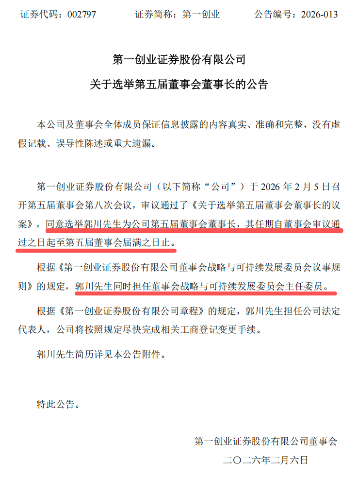 2月5日,第一创业发布公告,公司董事会审议通过议案,同意选举郭川为公司第五届董事会董事长,郭川同时担任董事会战略与可持续发展委员会主任委员。