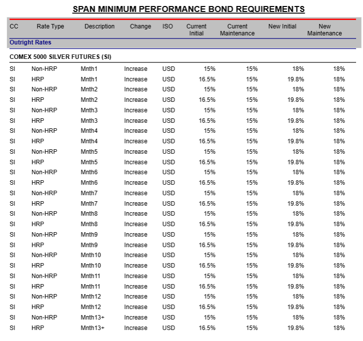 美国芝商所(CME)最新保证金公告显示,交易所将其COMEX 100黄金期货的初始保证金从8%上调至9%,将其COMEX 5000白银期货的初始保证金比例从15%上调至18%,2月6日收盘后正式生效。