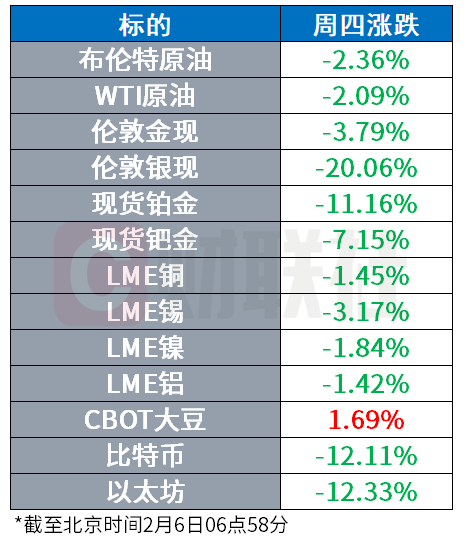 相较于美股市场,更大的冲击发生在白银和币圈。截至发稿,现货白银在周四下跌20%的基础上,周五早晨继续在芝商所进一步上调保证金的消息中下探,刚跌破每盎司70美元整数关口。黄金、工业金属也在市场情绪下普跌。加密货币也迎来了又一个暴跌的日子,以太坊日内跌12%,较去年高点跌去60%;比特币也跌至6.4万美元,较去年10月的历史高点折半。
