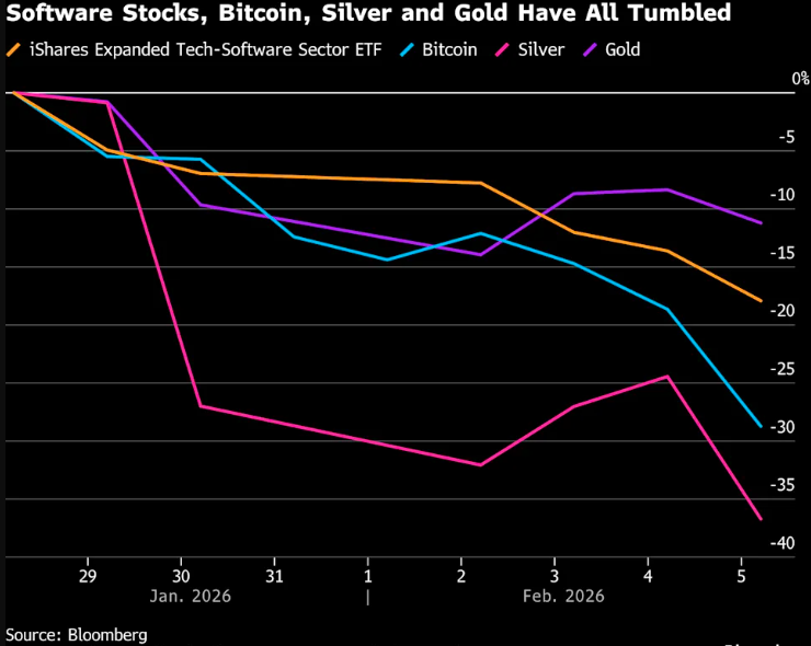 从表面上看,此轮跨资产抛售并没有单一诱因——不像去年四月美国总统特朗普掀起的“解放日”贸易战曾令市场陷入恐慌性暴跌。相反,当前的市场更像是被一连串利空消息“钝刀子割肉”。这些新闻不断加剧了市场对估值虚高的集体焦虑——毕竟许多人早已怀疑行情过热——最终诱发了投资者的同步撤资。