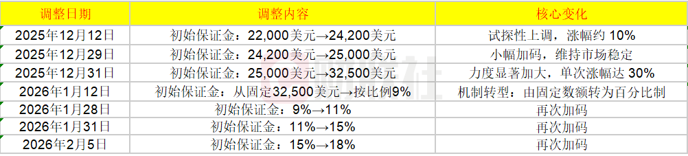 值得注意的是,在贵金属价格持续剧烈波动之际,芝加哥商品交易所周四也进一步上调了相关品种的保证金比例要求。其中,白银保证金为自去年12月以来第七次作出相应调整……