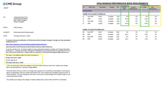 根据公告文件,CME此次将COMEX 100黄金期货的初始保证金从8%上调至9%,将COMEX 5000白银期货的初始保证金比例从15%上调至18%。