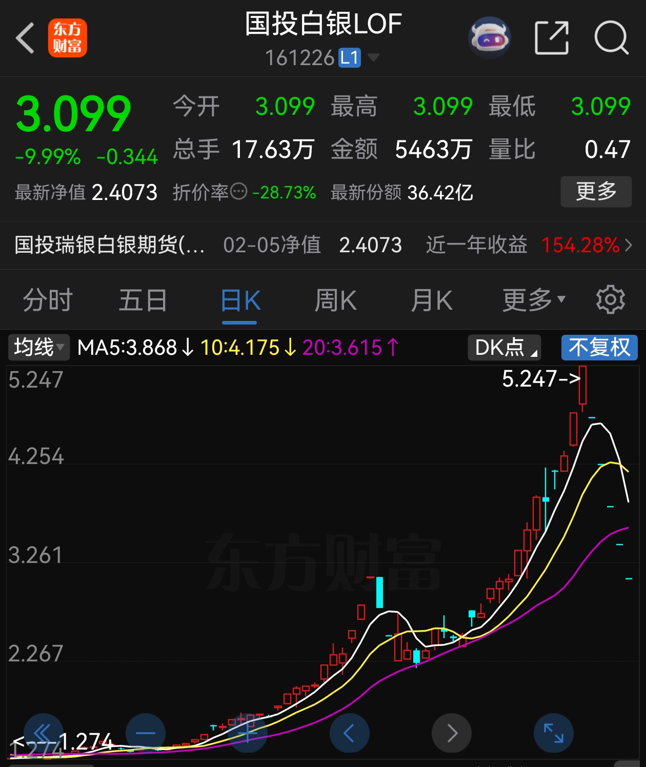 国投白银LOF场内2月6日开盘触达跌停,现报3.099元,溢价率回落至28.73%,已连收5个跌停。