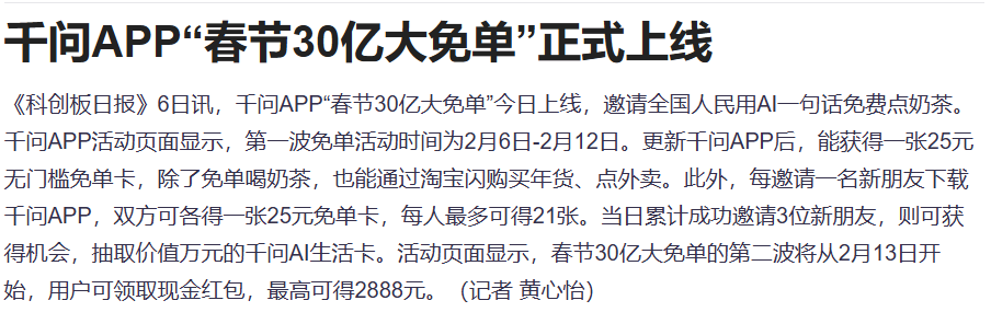 财联社2月6日讯(编辑 胡家荣)阿里巴巴旗下千问APP“春节30亿大免单”今日上线,邀请全国人民用AI一句话免费点奶茶。