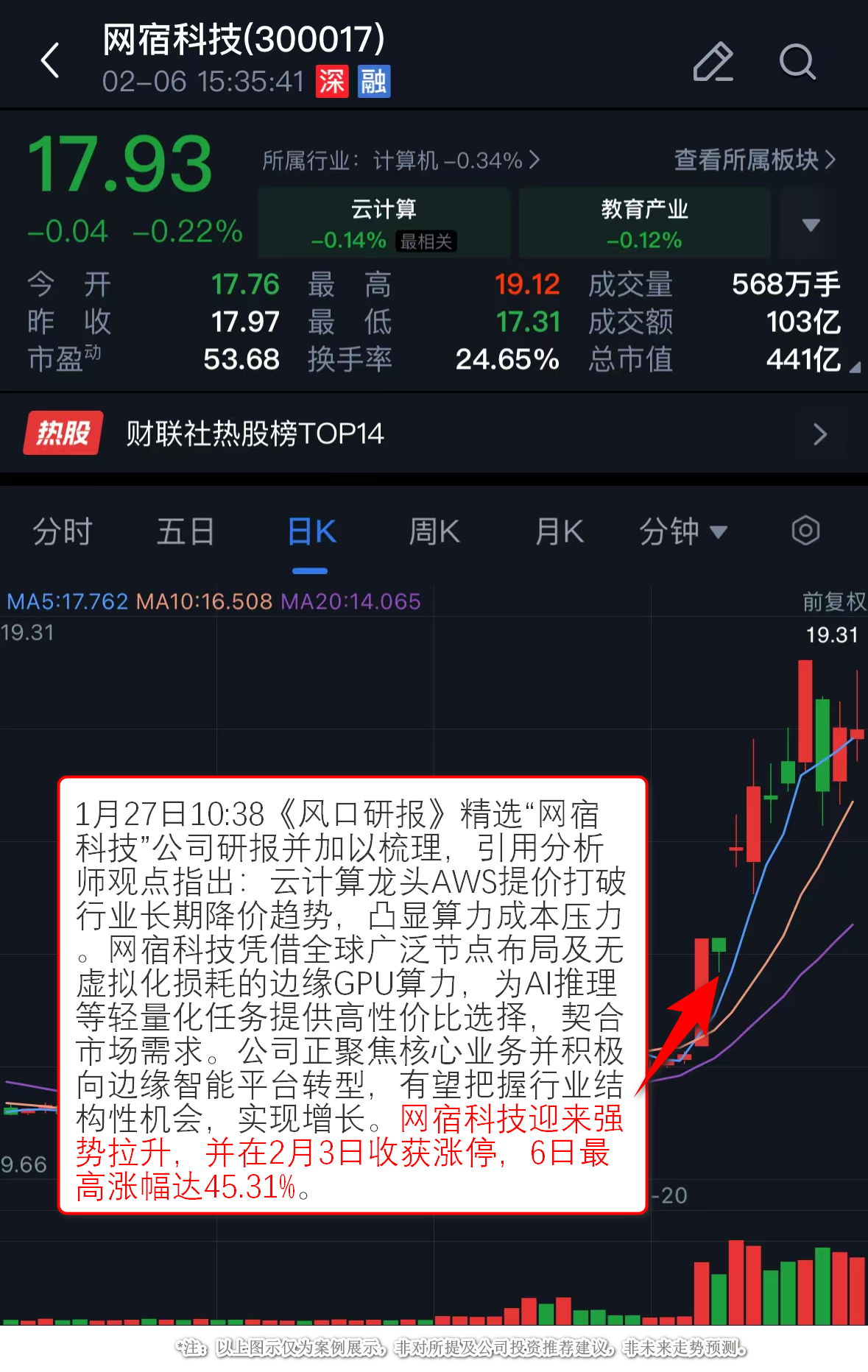 文章发布后,网宿科技随即迎来强势拉升,并在2月3日收获涨停,6日最高涨幅达45.31%。