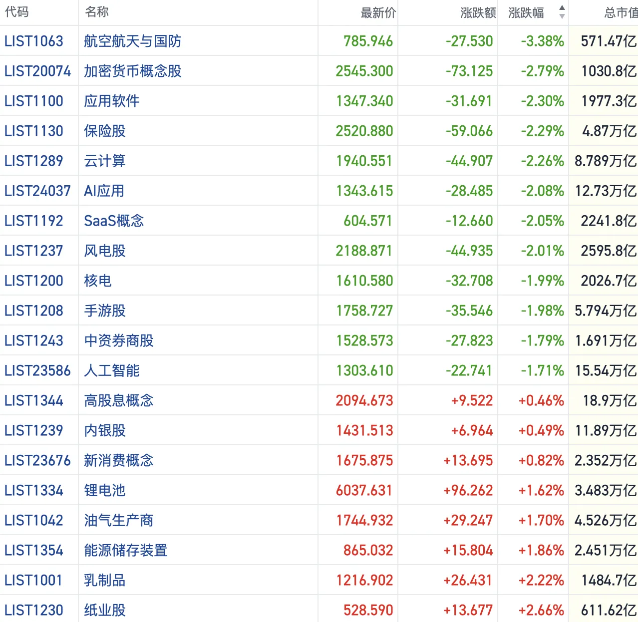 其他方向上,加密货币概念跌幅居前,黄金、有色板块继续下行。此外,大金融、游戏、半导体、软件、新能源等行业纷纷走跌。