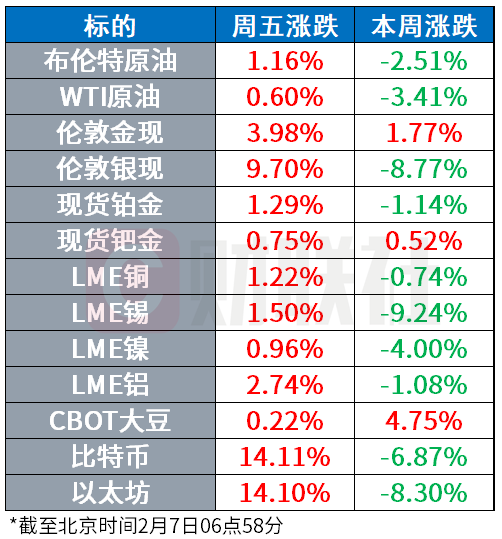 周五的大宗商品市场也迎来情绪反转。现货白银在早盘一度跌至64美元/盎司后反弹,最终以近10%的涨幅收官,最新报价为77.78美元/盎司。加密货币也在周五迎来反弹,比特币、以太坊均涨超10%。