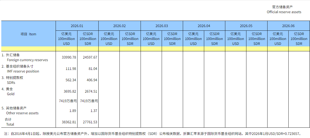 央行发布数据,中国2026年1月末黄金储备报7419万盎司,2025年12月末为7415万盎司,为连续第15个月增持黄金。