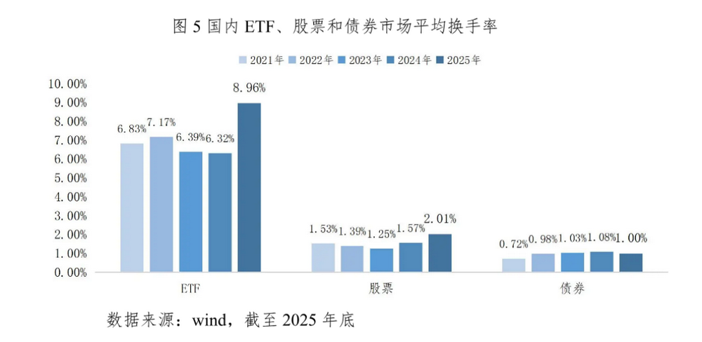 与股票和债券市场相比,ETF的交投活跃度也较高。深交所数据显示,2025年,A股ETF成交额占股票市场总成交额的比例稳定维持在6%左右,日均换手率由6.32%提升至8.96%,流动性显著高于股票和债券市场的平均换手率水平(2.01%、1%)。