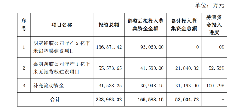 此前,明冠新材于2025年12月3日审议通过议案,将2022年度定增募投项目“明冠锂膜年产2亿平米铝塑膜建设项目”的预定可使用状态延期至2027年12月31日。