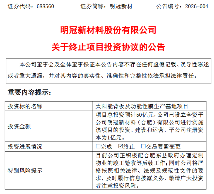 2月8日晚间,明冠新材发布公告,公司董事会已审议通过相关议案,决定终止原计划总投资50亿元的肥东县太阳能背板及功能性膜生产基地项目,并将产能重心转向技术壁垒更高、市场前景更明确的新型电池封装用特种功能膜,以应对行业产能过剩、盈利持续承压的行业现状。