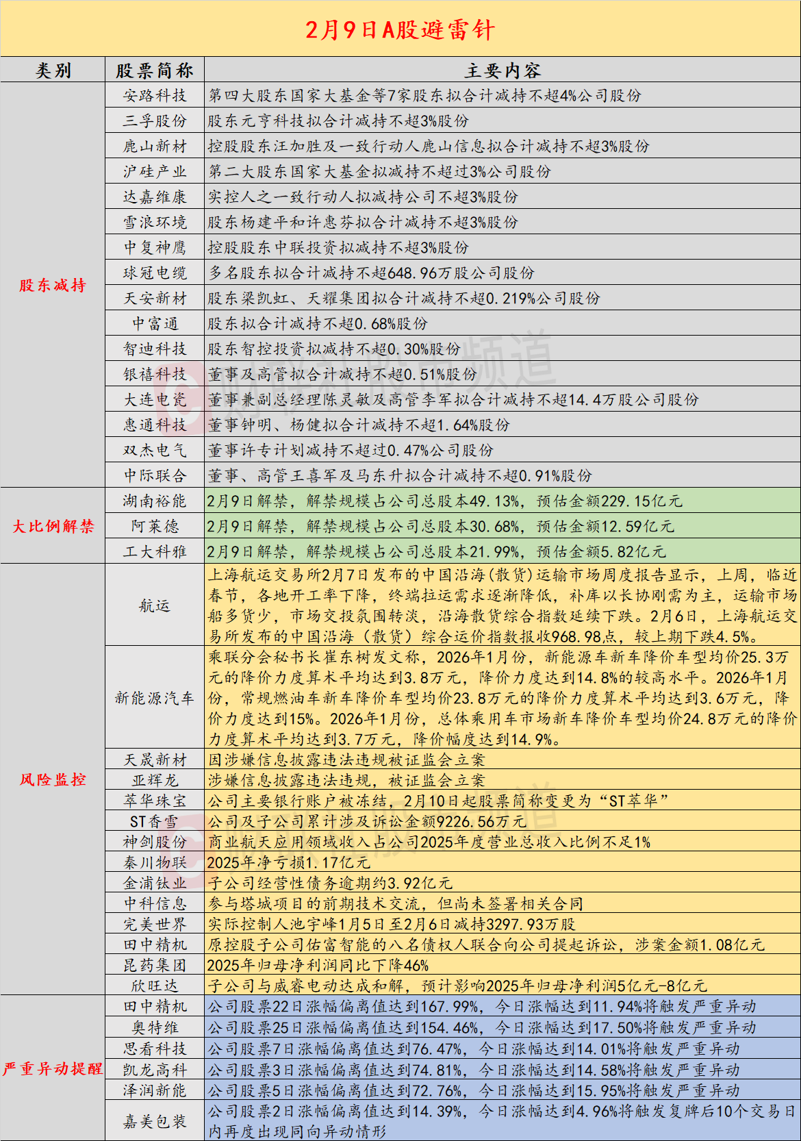 导读:财联社2月9日投资避雷针,近日,A股及海外市场潜在风险事件如下。国内经济信息方面包括:1)上海航运交易所报告显示,市场逐步转淡,沿海散货综合指数弱势下行;2)1月乘用车市场新车降价力度算术平均达到3.7万元;公司方面重点关注包括:1)萃华珠宝主要银行账户被冻结,2月10日起股票简称变更为“ST萃华”;2)天晟新材因涉嫌信息披露违法违规被证监会立案;海外市场重点关注包括:1)景林最新美股持仓显示,砍掉超6成的英伟达持仓;2)高盛交易部门称,随着算法抛售,股市将“颠簸震荡”。