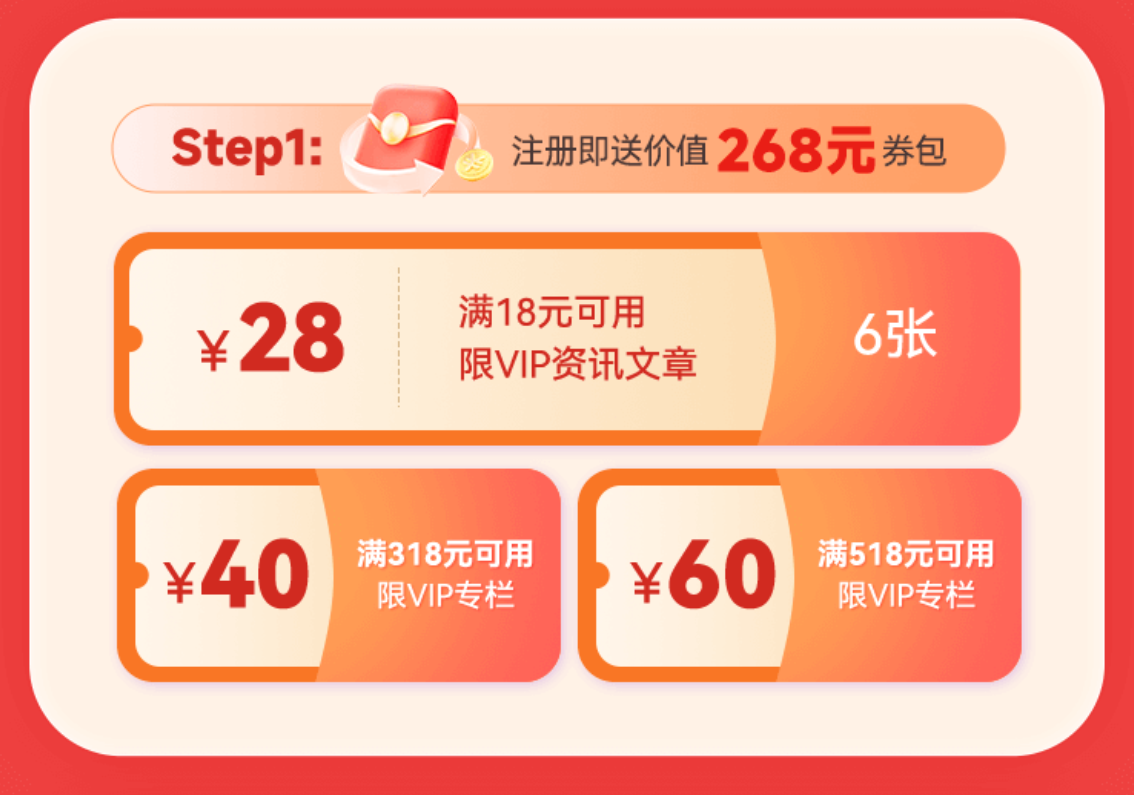 除了软性的陪伴服务,本次活动更以硬核礼包降低新人的投资试错成本。新人注册即可获得包含6张28元单篇解锁券的注册礼,覆盖《盘中宝》《风口研报》等王牌栏目的深度内容,相当于免费获取168元的专业资讯;叠加「满318减40」「满518减60」的VIP订阅满减券,进一步降低了高端资讯的准入门槛。