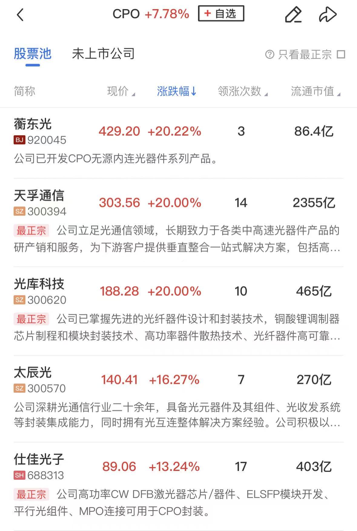 板块上,算力硬件股集体走强,天孚通信20cm涨停续创历史新高,光库科技、杰普特、长飞光纤、兆驰股份、安孚科技等涨停,炬光科技、太辰光、腾景科技、仕佳光子等个股涨幅居前。
