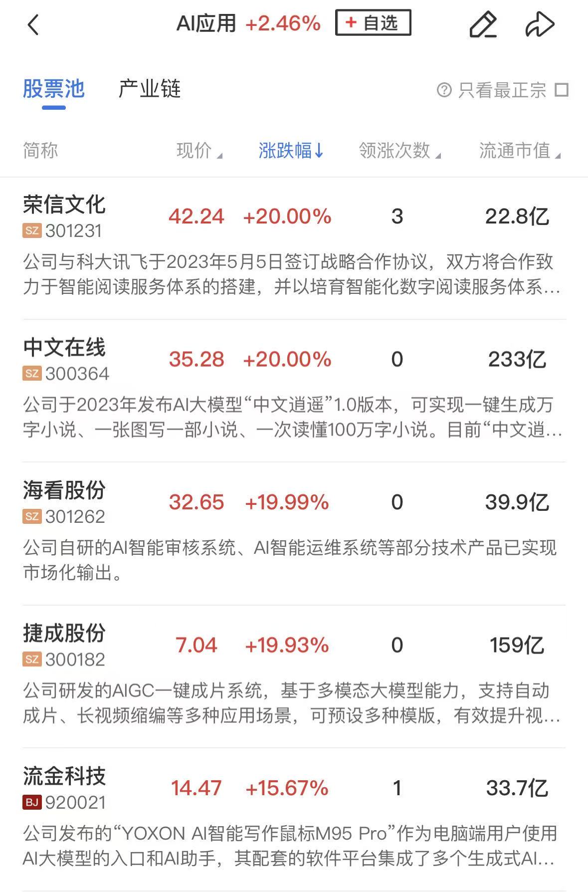 AI应用端反复活跃,荣信文化、中文在线、海看股份、掌阅科技、风语筑、欢瑞世纪涨停。