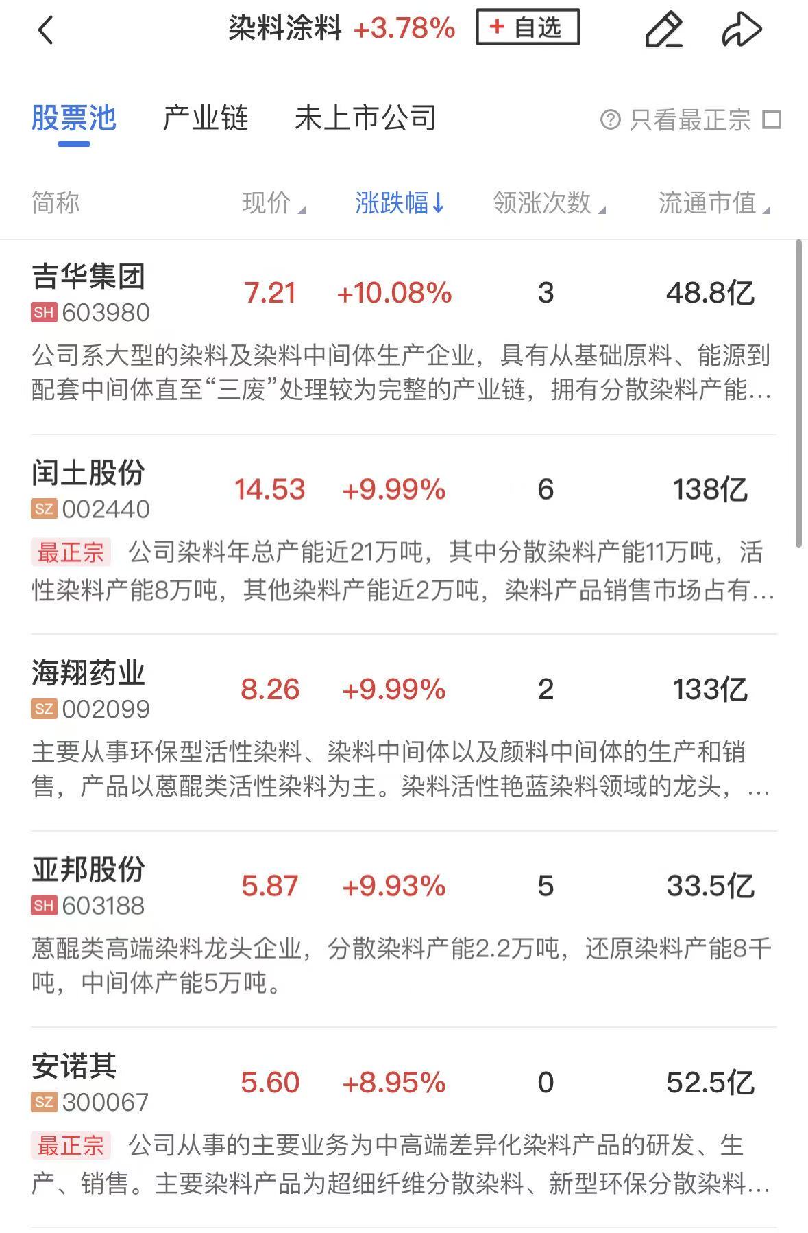 化工股再度走强,闰土股份2连板,吉华集团、海翔药业、亚邦股份涨停,浙江龙盛、新乡化纤、万朗磁塑等涨幅居前。