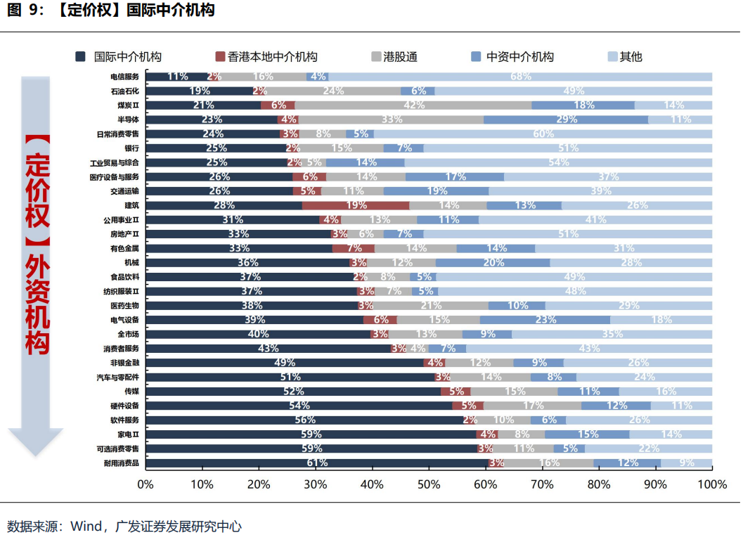 中资具有较强定价权的行业:电信服务、石油石化、煤炭、半导体、银行等。