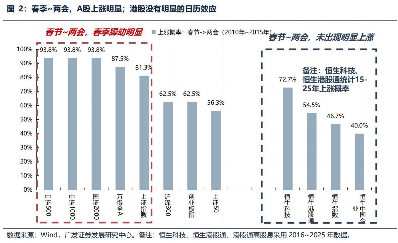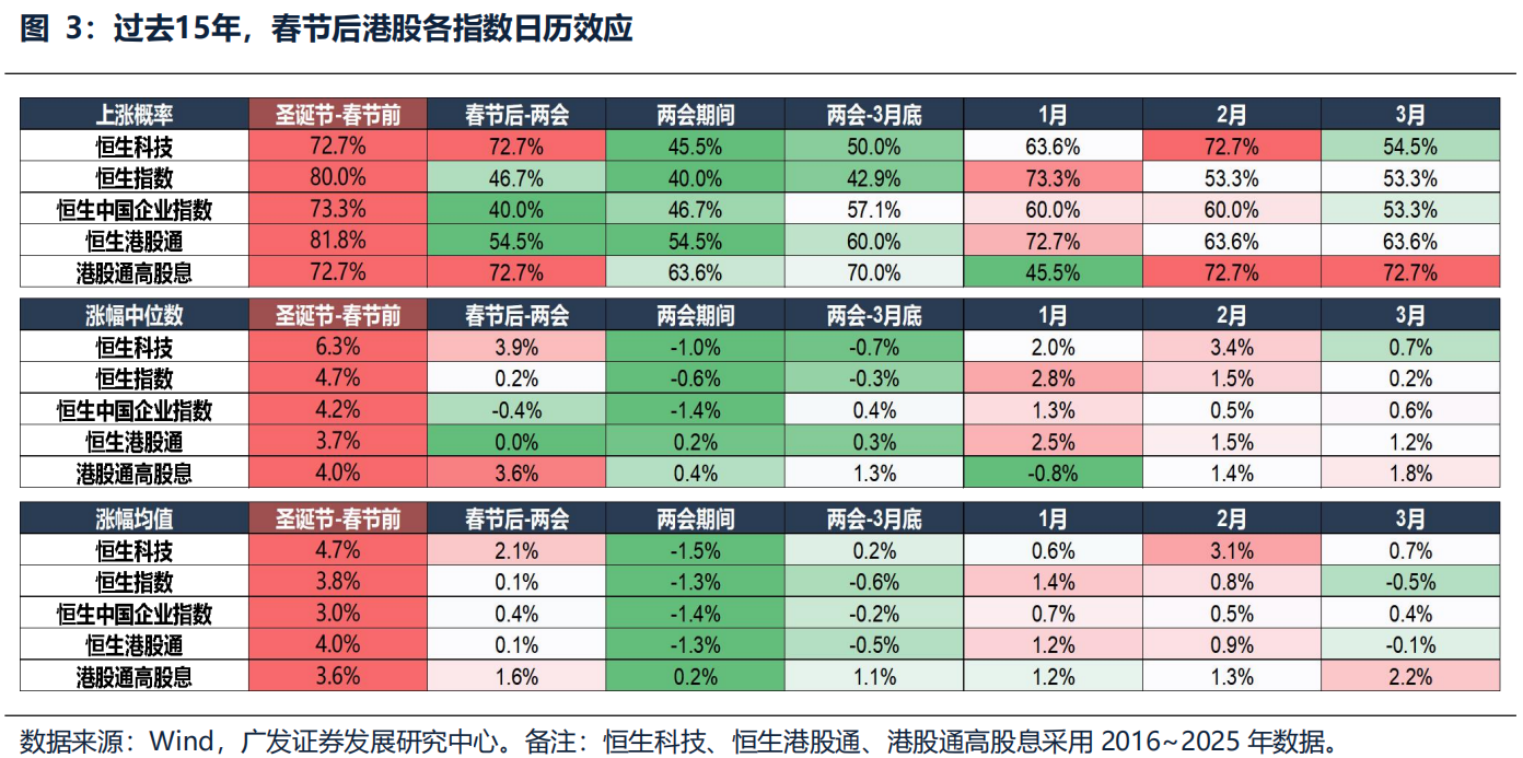 相比之下,节后表现则缺乏明显规律。春节后一个月内,恒生指数上涨概率仅为40%-60%,并未形成类似A股"春季躁动"的稳定模式。特别是春节后至两会期间,恒生指数上涨概率仅约46.7%,而恒生科技指数虽有72.7%的上涨概率,但统计样本较少且涨幅远不及节前表现。