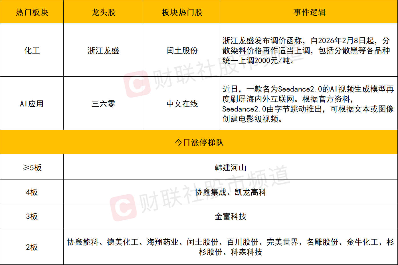 化工板块反复活跃,闰土股份2连板,红太阳、华尔泰、海翔药业、亚邦股份涨停。消息面上,2月8日,浙江龙盛发布调价函称,自2026年2月8日起,分散染料价格再作适当上调,包括分散黑等各品种统一上调2000元/吨。业内认为,本次分散染料涨价最核心的驱动力来自上游关键中间体还原物的价格飙升。其价格已从去年的2.5万元/吨大幅上涨至3.8万元/吨,涨幅超过50%。