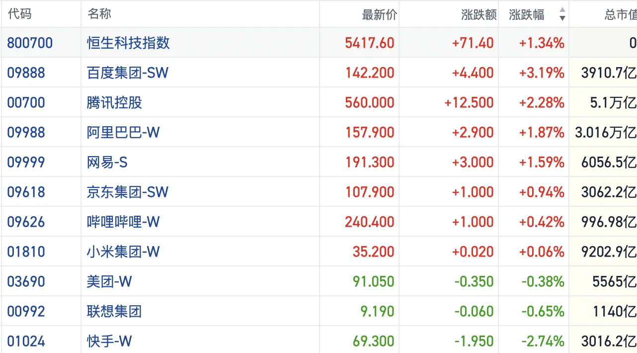 盘面上,今日大型科网股多数上扬助力情绪回暖,百度涨3%,腾讯涨超2%,阿里巴巴、网易、京东纷纷飘红,快手跌近3%。