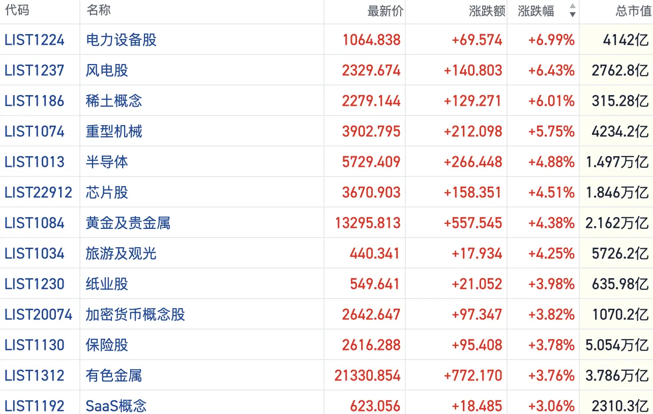 其他方向,大金融等权重股也集体活跃带动大市。AI产业链也出现大面积反弹,软件、半导体、算力等板块集体上涨。此外,黄金有色、机械、地产、煤炭等行业纷纷上涨。