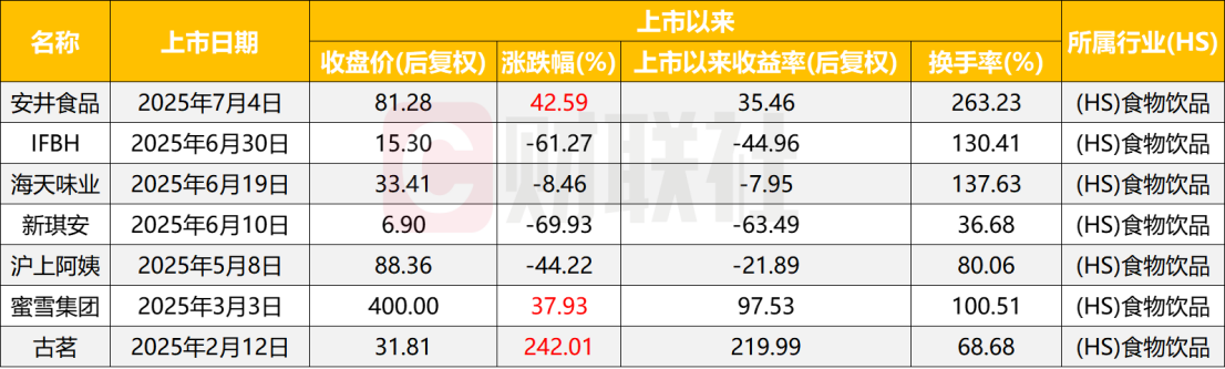 据Wind统计,截至2月6日收盘,股价上涨的公司有3家,分别是古茗、安井食品、蜜雪集团,上市以来的涨幅分别为242.01%、42.59%%和37.93%。余下的4家公司均出现不同程度的下跌,其中跌幅最大的是新琪安,自2025年6月10日上市至今,股价已经下跌69.93%,其次是IFBH和沪上阿姨分别下跌61.27%和44.22%。