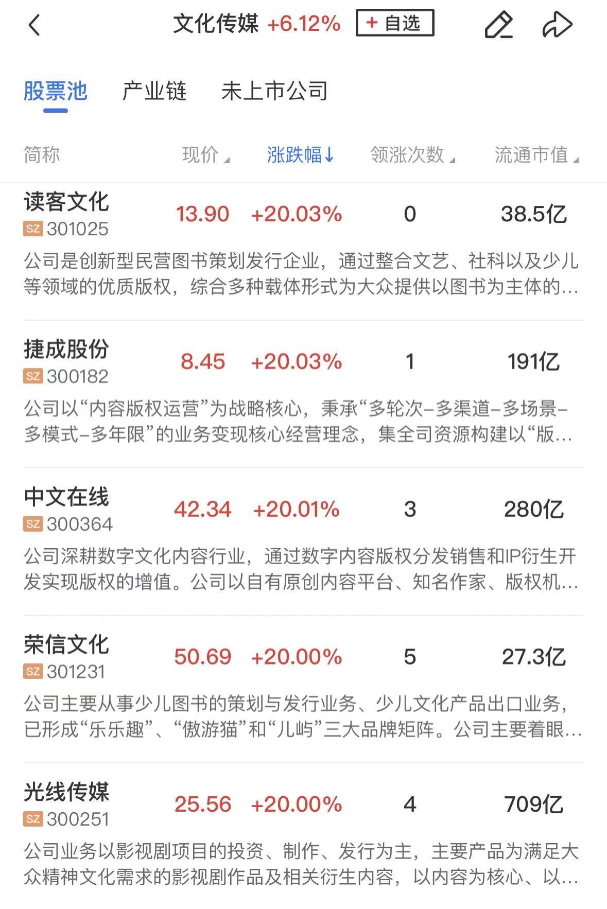 传媒板块同样全线走强,读客文化、中文在线、荣信文化、读者传媒、奥飞娱乐等个股涨停。