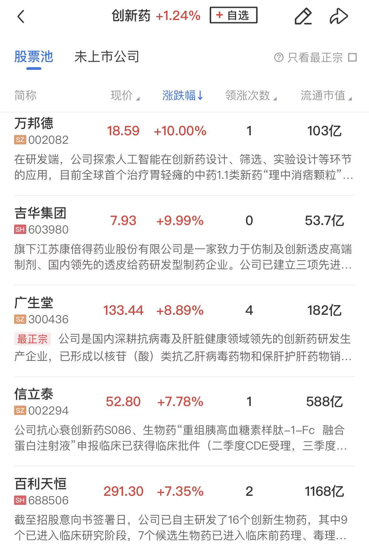 创新药概念盘中走强,万邦德涨停,广生堂、尖峰集团、信立泰、北陆药业、荣昌生物、首药控股等多股跟涨。