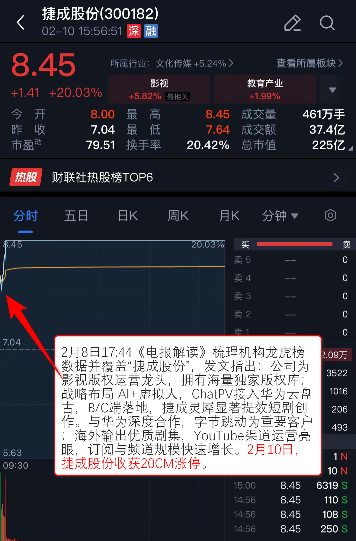 2月8日17:44《电报解读》梳理机构龙虎榜数据并覆盖“捷成股份”,发文指出:公司为影视版权运营龙头,拥有海量独家版权库;战略布局 AI+虚拟人,ChatPV接入华为云盘古,B/C端落地,捷成灵犀显著提效短剧创作。与华为深度合作,字节跳动为重要客户;海外输出优质剧集,YouTube渠道运营亮眼,订阅与频道规模快速增长。2月10日,捷成股份收获20CM涨停。