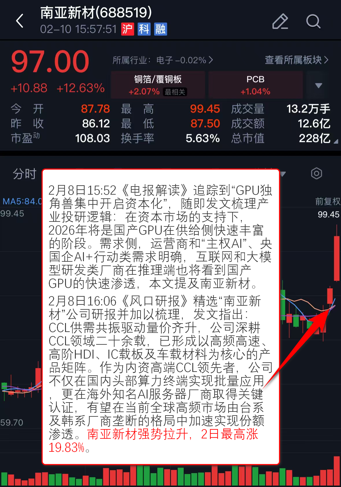 2月8日16:06《风口研报》精选“南亚新材”公司研报并加以梳理,发文指出:CCL供需共振驱动量价齐升,公司深耕CCL领域二十余载,已形成以高频高速、高阶HDI、IC载板及车载材料为核心的产品矩阵。作为内资高端CCL领先者,公司不仅在国内头部算力终端实现批量应用,更在海外知名AI服务器厂商取得关键认证,有望在当前全球高频市场由台系及韩系厂商垄断的格局中加速实现份额渗透。
