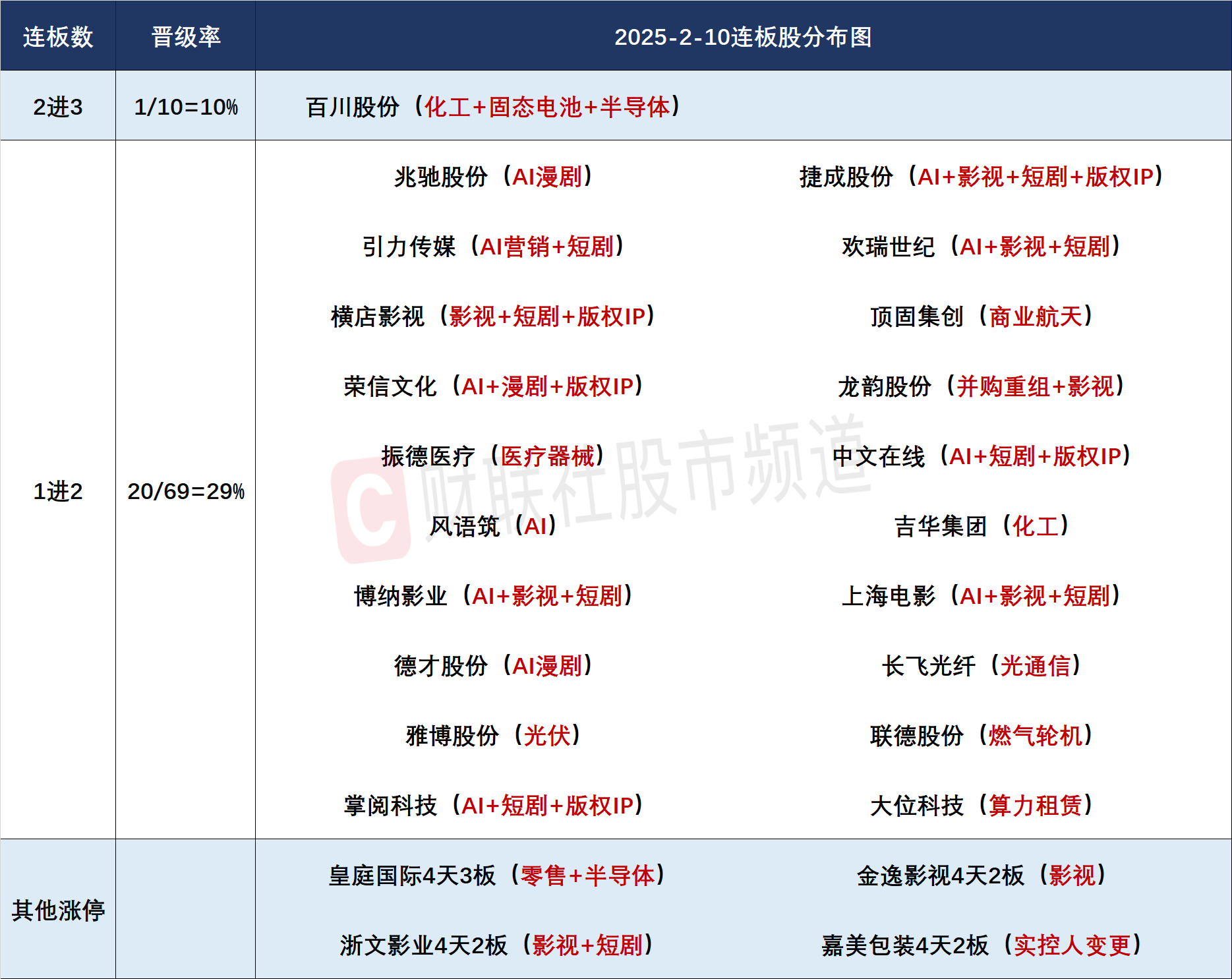 字节跳动旗下最新视频生成模型Seedance 2.0在即梦、豆包、小云雀等产品开启内测,引发国内国外广泛关注。与此同时,2026年春节档开启电影新片预售,截至发稿,新片预售总票房已突破1亿元。在多重消息面刺激下,荣信文化、兆驰股份、欢瑞世纪、捷成股份等多只Seedance概念股实现连板晋级,进而引爆影视、游戏等文化传媒类个股掀起涨停潮,影视板块人气股横店影视走出9天7板,续创历史新高,影视龙头股光线传媒录得20厘米涨停。此外受益Seedance 2.0紧急优化,暂停真人人脸上传,版权以及内容审查等AI应用端细分也迎来补涨,但与影视、短剧等人气核心细分的强度相比仍相去甚远。因此在今日整个文化传媒板块迎来无差别拉升后,反而不利于明日增量资金的承接,需关注板块内几只前排核心分歧之际引发的跟风品种的淘汰风险。
