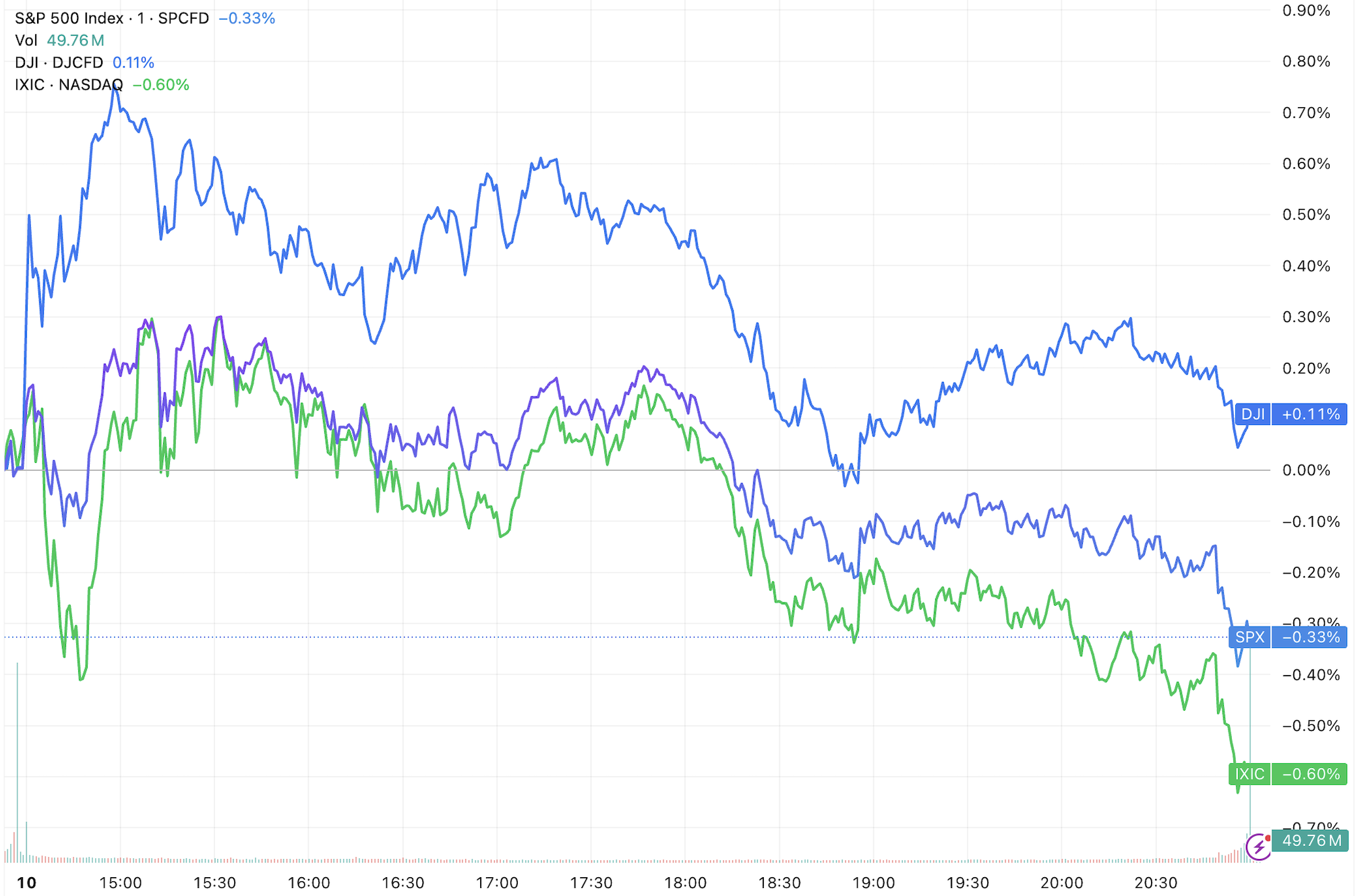 截至收盘,道琼斯指数涨0.10%,报50,188.14点;标普500指数跌0.33%,报6,941.81点;纳斯达克指数跌0.59%,报23,102.47点。