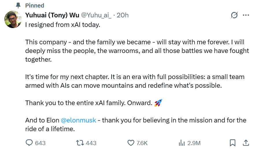 Wu在X上的博文写道,是时候开启人生的新篇章了。这是一个充满无限可能的时代,一支拥有人工智能的小团队可以移山填海,甚至可能重新定义一切。