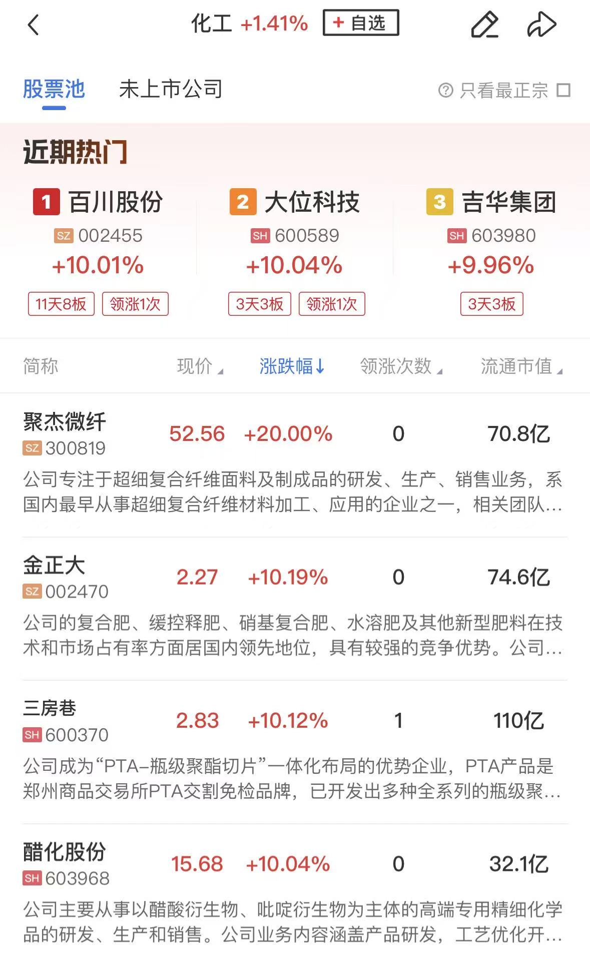 板块上,化工板块近期再度走强,吉华集团5天4板,三房巷、百川股份、醋化股份、华尔泰涨停,长青科技、沃特股份、新凤鸣涨幅居前。