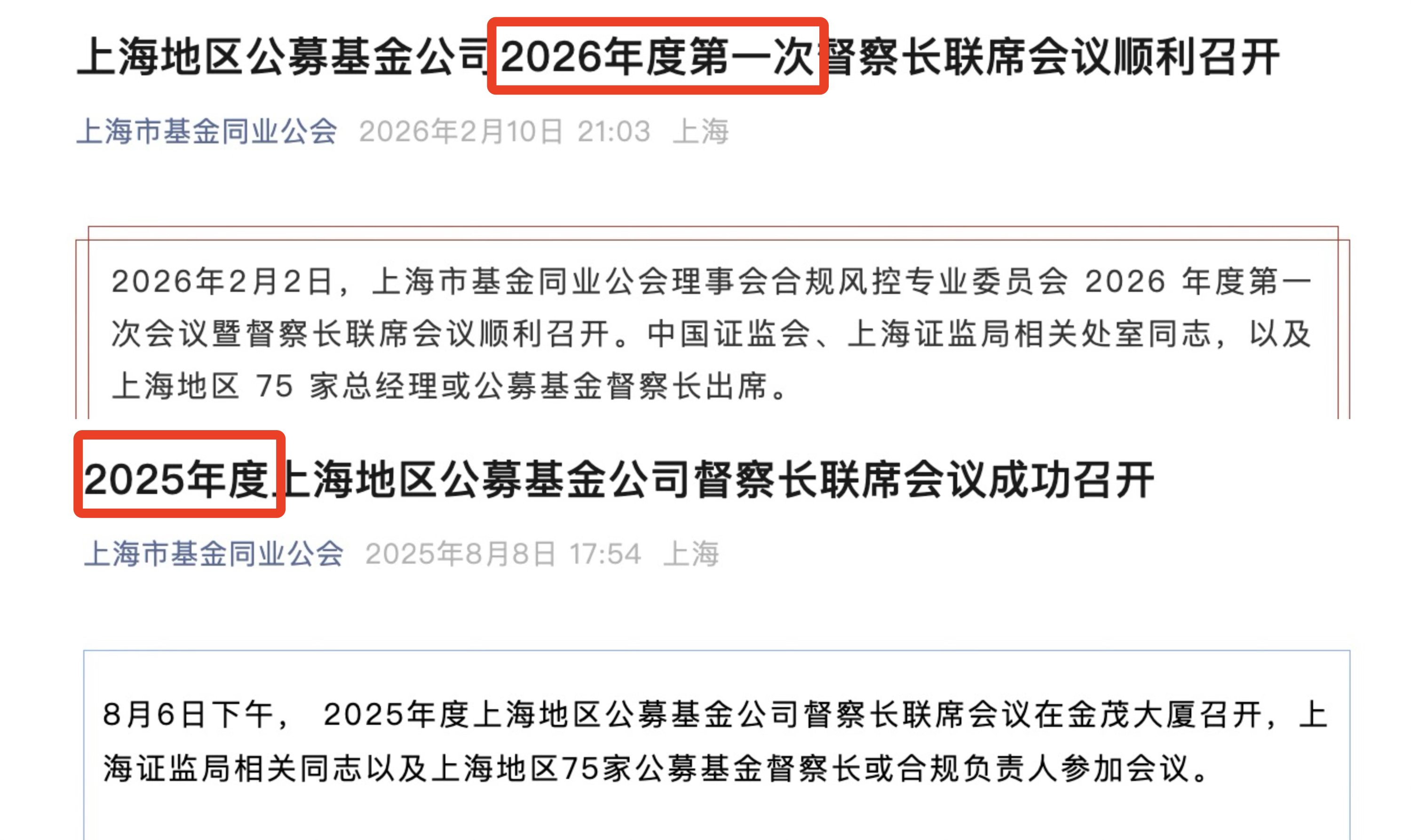 上海市基金同业公会2月10日通过微信公众号发文指出,上海市基金同业公会理事会合规风控专业委员会2026年度第一次会议暨督察长联席会议,已于2月2日召开。中国证监会、上海证监局相关处室负责人,以及上海地区75家公募基金公司的总经理或督察长出席会议。