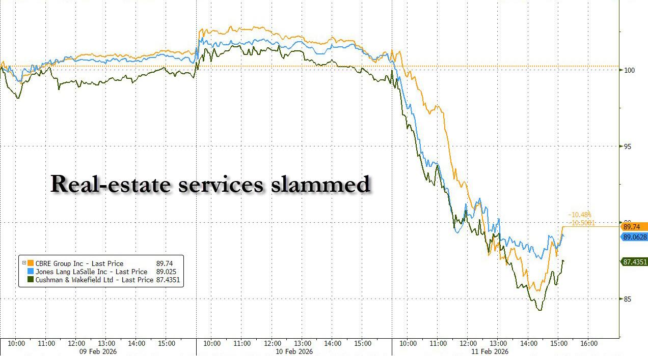 行情数据显示,随着业内对AI应用带来行业颠覆的恐惧进一步蔓延,两周来美股市场上的第四个“受害者”也正随之出现——周三,多只地产服务股纷纷大幅下挫,投资者开始评估这些公司面临最新人工智能应用和工具冲击的脆弱性。
