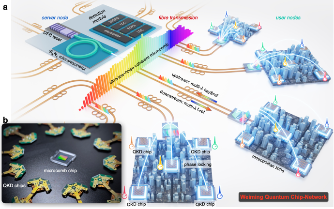研究团队成功研制出全功能集成的高性能量子密钥发送芯片与光学微腔光频梳光源芯片,并在此基础上构建了全球首个基于集成光量子芯片的大规模量子密钥分发网络——“未名量子芯网”。该量子网络支持20个芯片用户并行通信,两两通信距离达370公里并打破无中继界限,组网能力(客户端对数 × 通信距离)达3700公里,在芯片用户规模与组网能力上均达到国际领先水平。