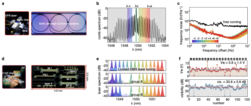 图2系统展示了微腔光梳芯片与QKD发送芯片的关键性能。如图2a–c所示,自注入锁定在产生暗脉冲频率梳的同时显著抑制相位噪声。该频梳工作于1550 nm通信波段,自由光谱程为30 GHz;锁定后梳齿频率噪声功率谱密度的白噪声基线约为13 Hz2Hz-1,对应短时线宽约40 Hz,展现出优异的相干性,并可稳定连续运行超过12小时。图2d给出了用户端磷化铟QKD发送芯片的结构设计及电学封装后的实物图。片上集成分布式布拉格反射器(DBR)激光器的调谐范围如图2e所示,在注入锁定条件下,其频率与相位可高度复制种子光,线宽达到相当水平。对20个用户芯片上的120个相位调制器(构成60个强度调制器)测试结果显示,平均半波电压约5.8 V,干涉消光比超过33 dB,其中117个器件性能正常,良率达97.5%。值得强调的是,该研究还证明了微腔光梳芯片与QKD发送芯片在晶圆级工艺下表现出高度一致性与高良率,表明该技术路线具备低成本规模化制造潜力,对构建大规模量子通信网络具有关键意义。