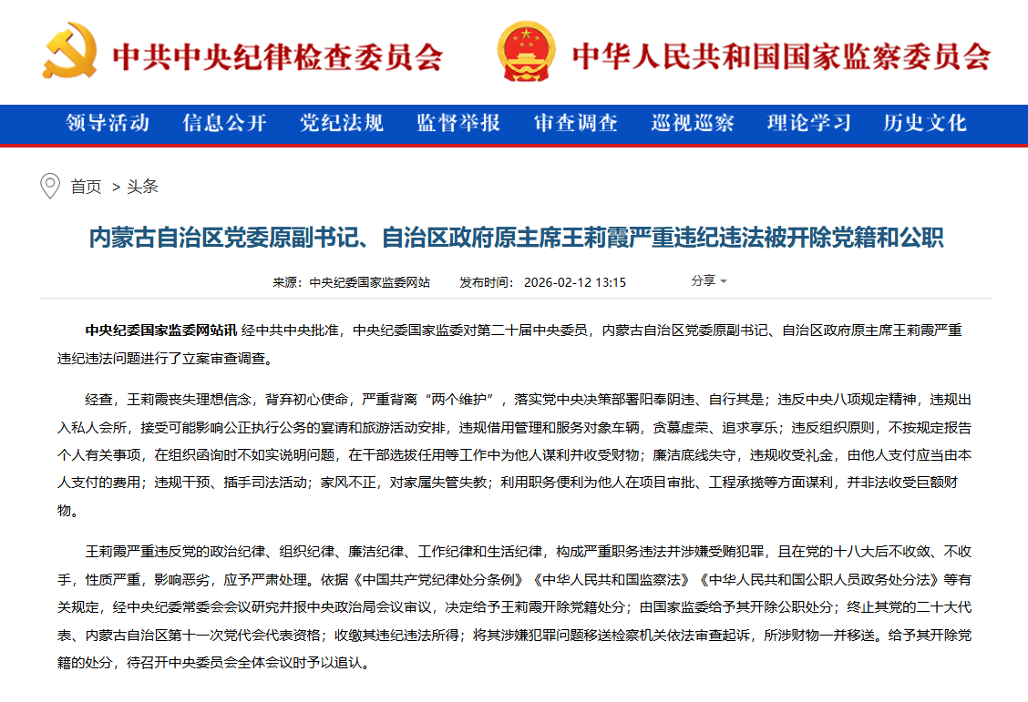 财联社2月12日讯,据中央纪委国家监委网站消息,经中共中央批准,中央纪委国家监委对第二十届中央委员,内蒙古自治区党委原副书记、自治区政府原主席王莉霞严重违纪违法问题进行了立案审查调查。