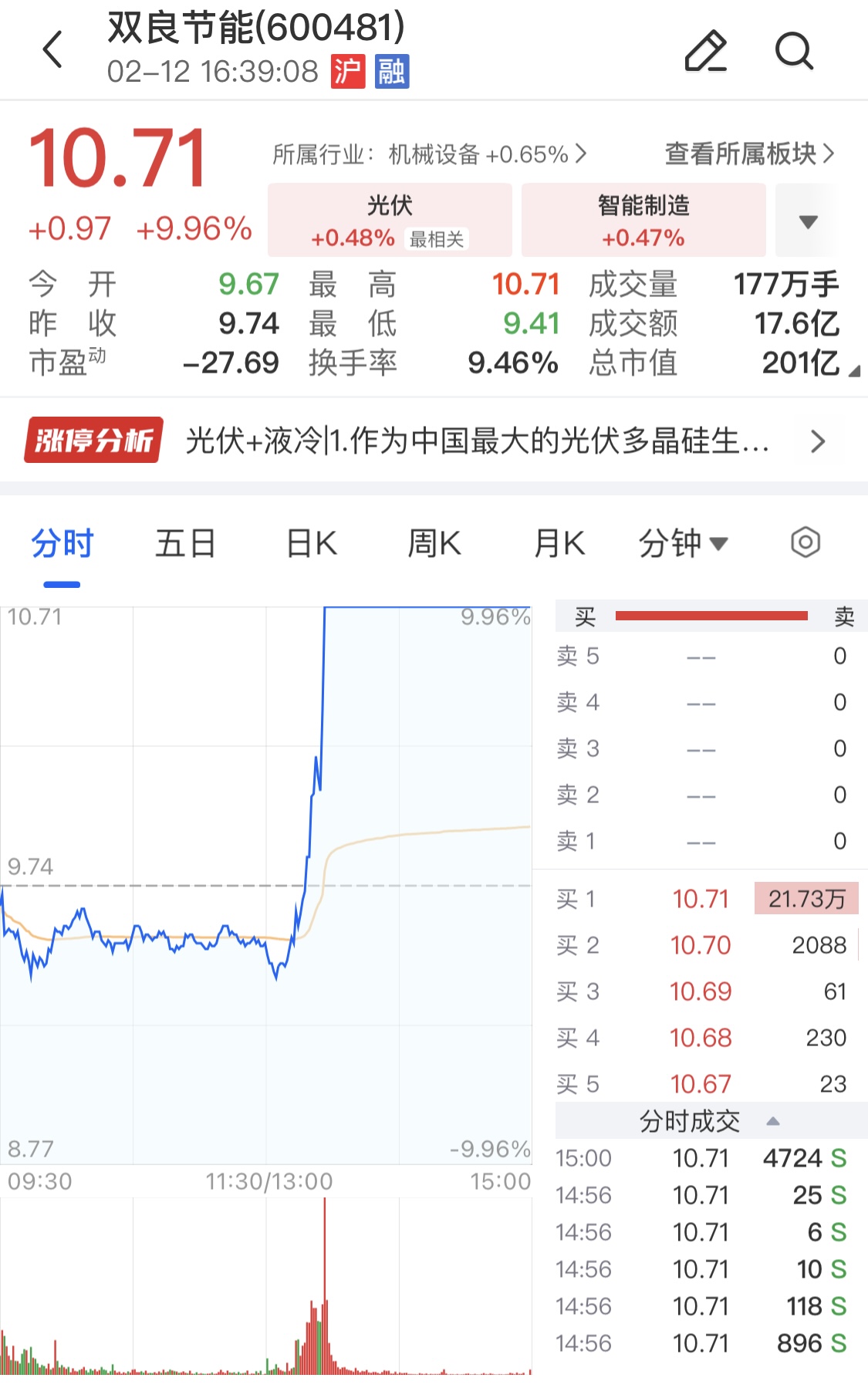 财联社2月12日讯,今日午后开盘10分钟左右,双良节能股价异动,并快速拉向涨停。截至收盘,其股价报10.71元/股,市值为201亿元。消息面上,今日13:02,双良节能在微信公众号上发布“近日再获3个海外订单”消息,而交易关联方正是马斯克旗下太空探索技术公司Space X。