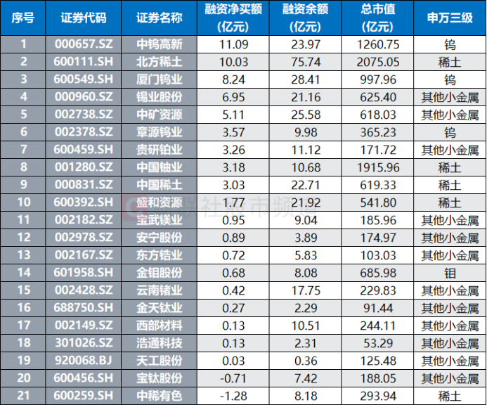 以整个板块层面统计,筛选小金属(申万二级)股,21只两融成分股中累计共有19只年内融资余额录得增长。其中,中钨高新、北方稀土2股唯二融资净买额在10亿元以上,厦门钨业、锡业股份、中矿资源融资净买额分别达8.2亿元、6.9亿元、5.1亿元,章源钨业、贵研铂业等股也获融资客重点关注。仅有中稀有色、宝钛股份2股融资余额年内下降。